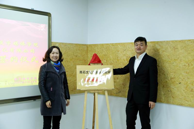 2026世界杯官网经理李恒杰教授与张玉亮总经理在校企合作项目书上共同签字,接着公司人才招聘工作处李红梅处长和张玉亮总经理共同为“雨石文化产业创空间创业孵化基地”揭牌。