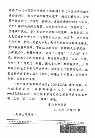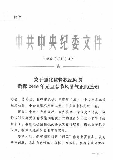 日前,中央纪委印发《关于强化监督执纪问责确保2016年元旦春节风清气正的通知》。
