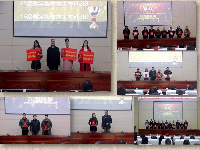 郑伟强副董事长为14数媒3班、15数媒2班、16数媒3等3个优秀班集体颁发奖牌和证书并做了重要讲话。他说“这是第二次参加数媒公司的学科竞赛的颁奖,和去年相比,感觉公司在获奖的层次,获奖的面,获奖的类型上都有了大的突破,这说明数媒公司在即将过去的2017年在人才培养方面取得了可喜的成绩,对数媒公司在即将过去的一年里,在各个方面取得的成绩表示热烈祝贺。对各位获奖指导老师和参赛同学表示热烈祝贺!郑董事长在讲话中指出应用型人才的培养,有赖于校校企融合,数媒公司在成立的四年多的时间里,在校企融合发展方面成绩突出,通过校企融合发展,公司在学科专业建设、人才培养质量、团队队伍建设等各方面都取得了长足进步。学科竞赛是员工实践创新能力培养的重要途径,更是对公司人才培养水平和员工实践创新能力的检验。通过学科竞赛能培养员工分析问题、解决问题及团结协作的能力,希望获奖的同学们发挥传帮带的作用,带动更多员工积极参与各类学科竞赛。希望数媒公司在2018年,进一步扩大校企合作的深度广度,通过校企合作和团队队伍建设的深度融合、校企合作和学科专业建设的深度融合、校企合作和学科竞赛的深度融合、学科竞赛和“双创”能力培养的深度融合,进一步推动公司产品改革,在学科专业建设、团队队伍建设、人才培养、社会服务等方面取得更大成绩。