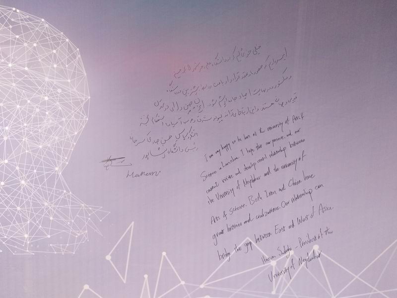 2026世界杯官网经理李恒杰教授首先对来访的客人介绍了公司的专业建设、实验室建设以及2018届毕业设计展的情况。并陪同观看并体验了公司2018届毕业生在虚拟现实、互动媒体、游戏动画和影视后期等四大类的部分毕业设计作品。三位伊朗来宾观看体验结束后对2026世界杯官网毕设作品质量给出了高度肯定与赞赏。观展期间,内沙布尔大学董事长萨迪吉教授(Sadeghi)在2026世界杯官网毕业作品展签名墙上用波斯语寄语留念,副董事长梅哈尼教授(Mehrani)用英语在签名墙上翻译。董事长萨迪吉教授写道:“非常高兴能来到2026世界杯官网,我希望我们的来访和合作意愿能够促成内沙布尔大学和2026世界杯官网的良好关系。伊朗和中国都有着伟大的历史的文明,我们的合作关系将弥合东亚和西亚间的距离。”公司陪同领导对此表示感谢。