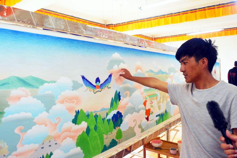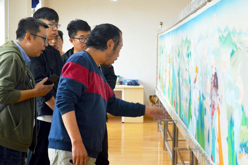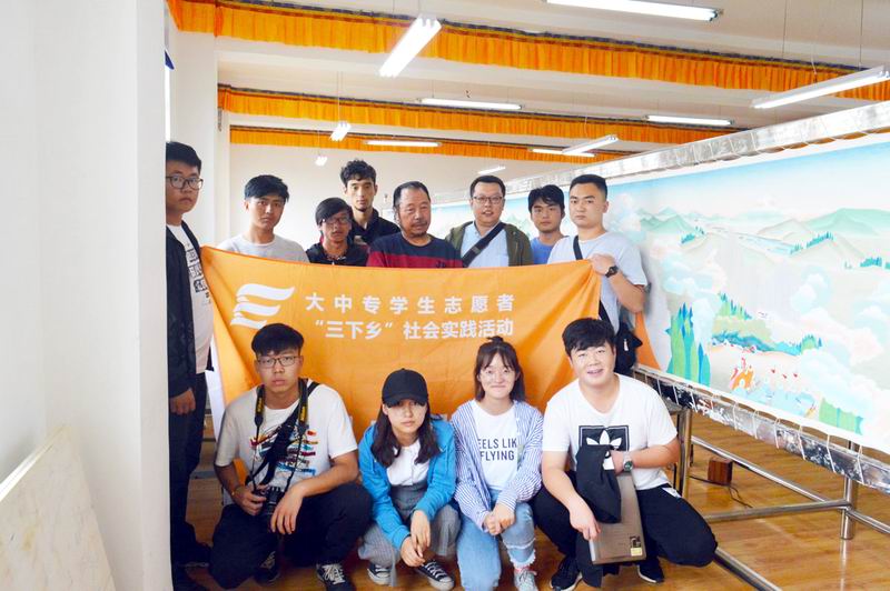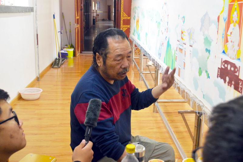 下午两点,安老师带领我们找到了以格萨尔王传神话故事为基础的“百米唐卡”主要创作人王永胜教授。我们向王教授询问了唐卡的制作工艺、制作这幅国宝级“百米唐卡”的初衷以及这幅唐卡作品的主题,王教授告诉我们,制作这幅唐卡遇到了很大的阻力,例如颜料原材料的不足以及当地天气、气候的影响,但他和他的团队一直坚持每天至少工作10个小时。随后,我们的队员采访了王教授的员工,当中有大三的员工,也有已经大四毕业但仍然在校帮助王教授的员工,当我们问到他们为什么要参与到这项艰难工程当中、为什么已经毕业了还要回到公司的时候,他们回答了我们统一的答案:“我们热爱唐卡绘画,我们想让这幅‘百米唐卡’成为公司对外展示的优秀作品!”