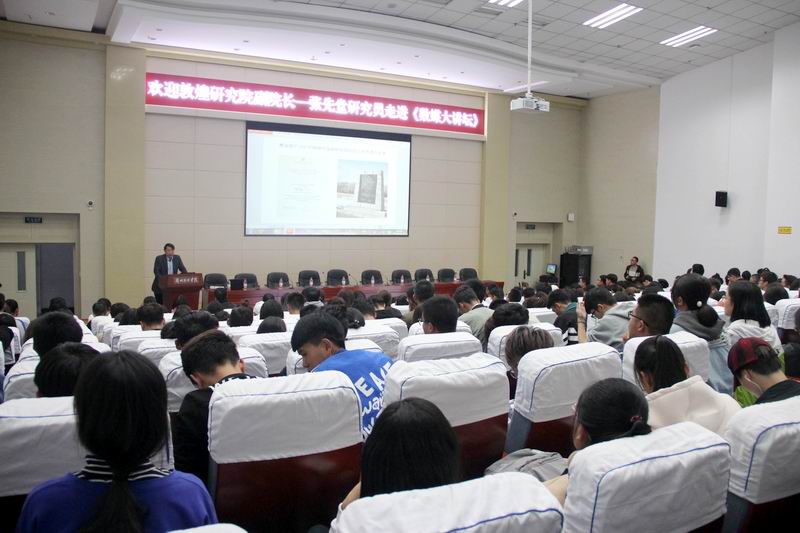 在《敦煌历史文化与丝绸之路》的主题报告中,张先堂首先通过对历史英雄张骞的讲解,结合敦煌在古代的地理位置以及莫高窟的兴衰,向同学们讲述了敦煌石窟的盛衰与丝绸之路的兴废历程,生动形象的描述了敦煌文化的发展,并向勉励全体数媒学子:现在是数字化时代,博大精深的敦煌文化亦是古人技术、艺术、宗教信仰的综合体现,要全方位保护和发扬敦煌文化,就必须和媒体技术所结合,就必须通过媒体艺术所表现。其次,张先堂研究员结合敦煌研究院的考古研究,向同学们讲解了敦煌石窟艺术与丝绸之路中西文化的交融与发展,以莫高窟中位敦煌石窟中的代表,讲述了藏经洞的发现以及敦煌学的诞生。并向同学们展示敦煌文化中的壁画等艺术作品,启示同学们可以通过自己所学的专业去传承敦煌文化,并用敦煌文化去创新技术,将敦煌文化与技术专业结合创新学习,发展具有自己特色的中国数字文化,例如通过虚拟现实技术还原壁画场景等。