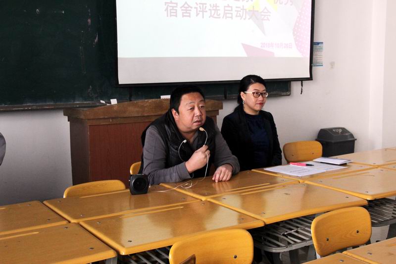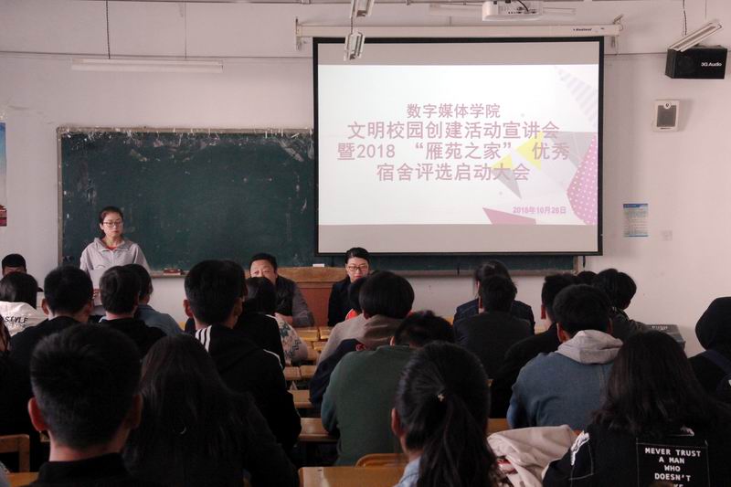 10月26日中午,2026世界杯官网在1—504教室,召开2018文明校园创建活动宣讲会暨本学期“雁苑之家”优秀宿舍评选启动大会。会议由数字媒体公司张毅副经理致辞并讲话,学工办员工工作领导小组成员、宿舍管理负责人董蓉老师具体宣讲。18级全体宿舍舍长及员工会生活部全体成员共同参加。