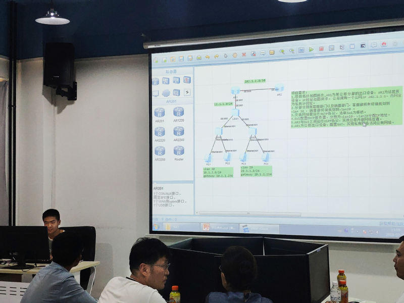 汇报会上,17计算机网络班的员工选举了两名员工代表依次展示了自己的作品,两位同学依次从企业的需求方面出发,利用之前的理论基础和这两周的实训经验,对整个企业网络进行分析、规划和OSPF、NAT等协议的配置,整个过程连贯流利,最后由学习委员曾丹对这次实训做了总结报告。