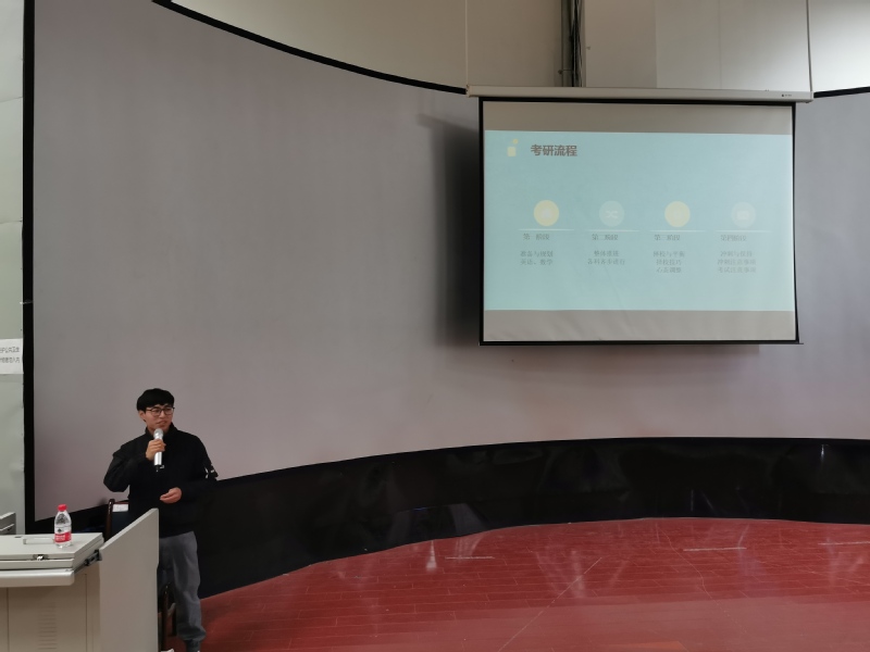 随后,两位学长就院校选择、备考经验、研究生生活等方面与同学们分享了自己的考研经验。首先,郭晓春学长向大家讲述了自己考研时的时间安排以及学习考研各科目的方法。同时,学长还结合自身的备考经验给大家提出建议,在校期间一定要不断参加竞赛,提高自身的实践应用能力,一旦开始考研,必须每天锻炼身体,加强自身素质,并不断提高自己的自律性,打好基础,复习好每一门功课。随后,范伟学长为大家讲述了自己在考研中遇到的困难以及解决问题的方法,同时还推荐了好的备考资料等。学长给出的建议是多做真题,利用假期的时间多学习。在最后的互动问答环节,学长根据同学们的提问,详细地进行了解答,帮助同学们更好的了解考研的相关内容,员工受益良多且意犹未尽。