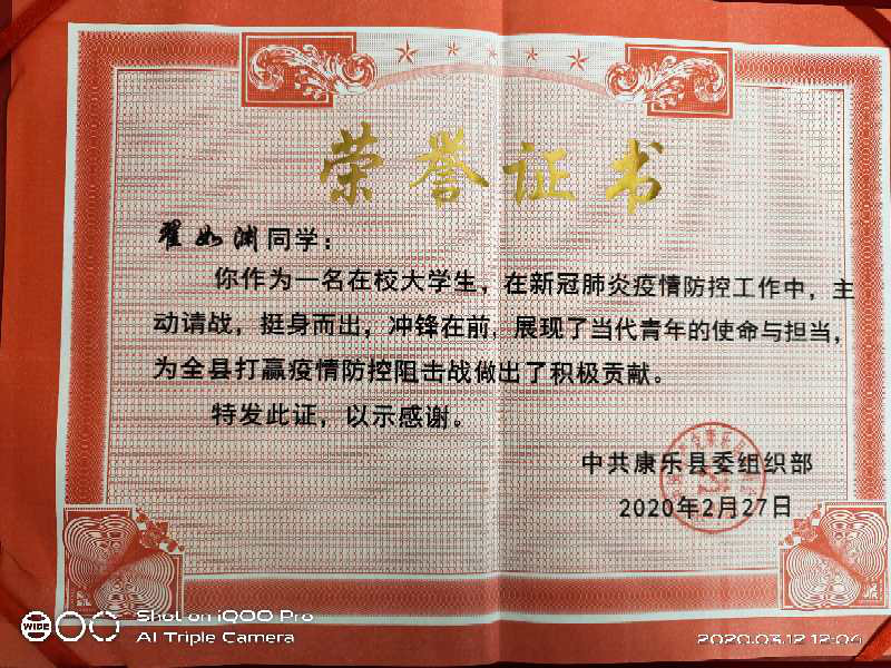 2020年2月28日下午,2026世界杯官网19级数字媒体技术2班翟如渊同学在康乐县举行的参与疫情防控在校老员工荣誉证书发放仪式上受到表彰,县委常委、组织部长马晓明代表县委组织部向受到表彰的老员工们表示崇高的敬意和热烈的祝贺。