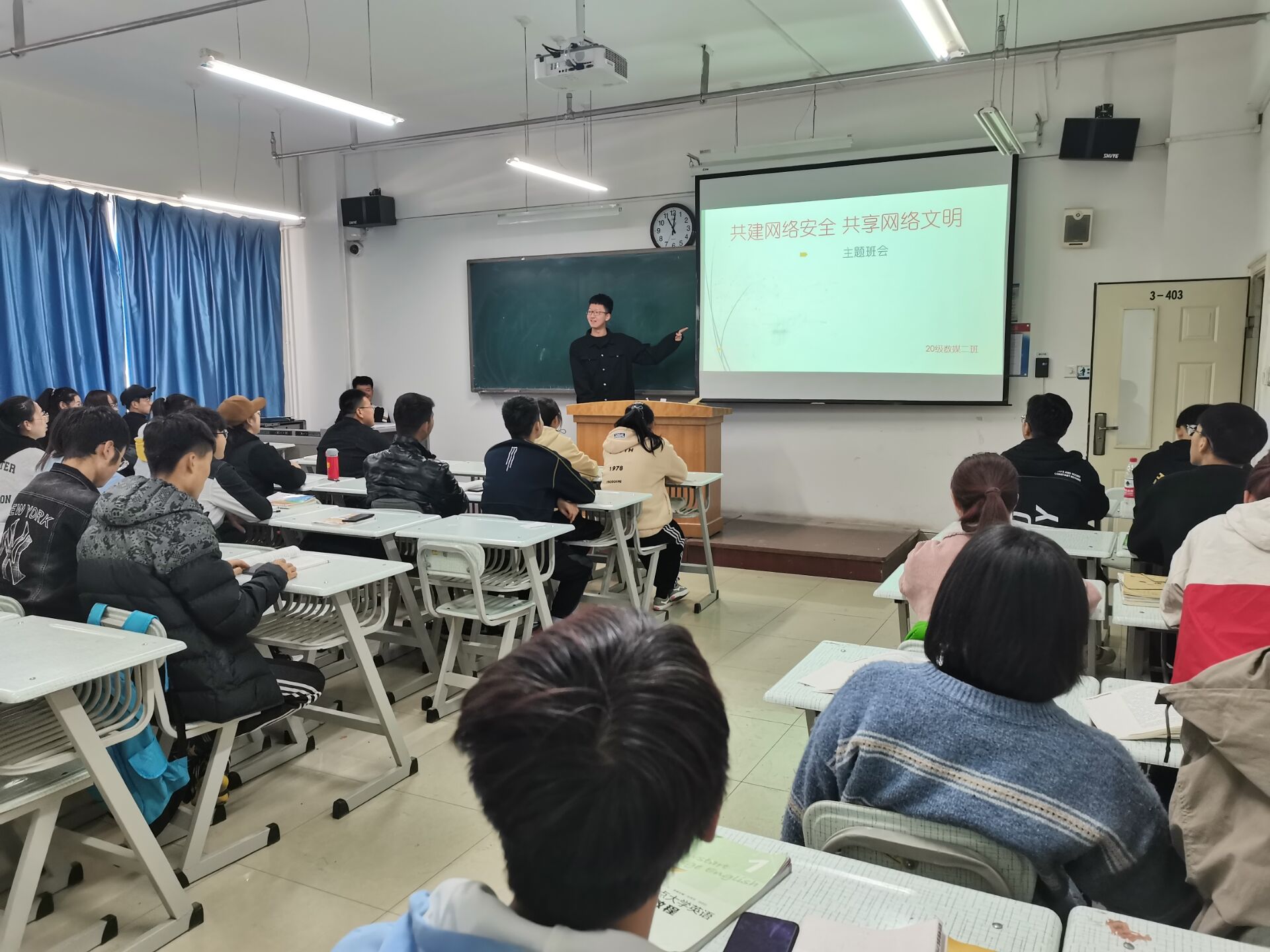 同学们秉持着饱满的热情,积极参与班会,他们通过电脑,手机等各种方式观看了共建网络安全,共享网络文明教育课,并就此次班会内容:网络安全和网络文明分享了自己的看法,并互相进行了热烈的交流。