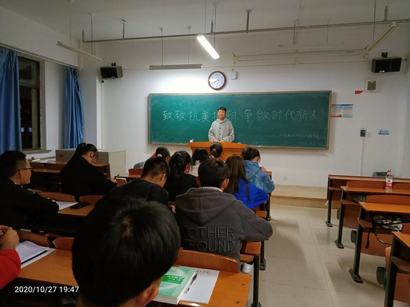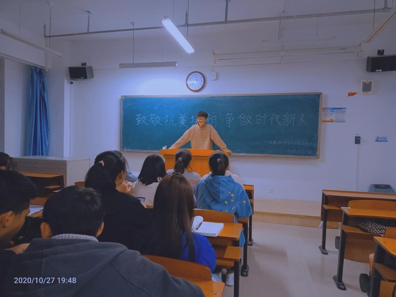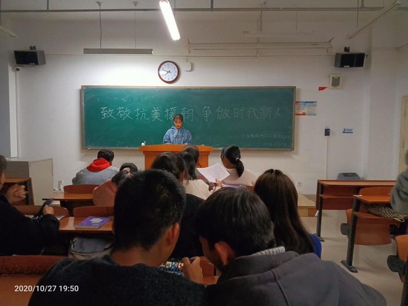 2020年10月27日,数据科学与大数据技术班举行了致敬抗美援朝主题班会。班会由班长杨想龙召开。本次班会主要讲述了抗美援朝的历史过程、英雄人物事迹、学习英雄精神。