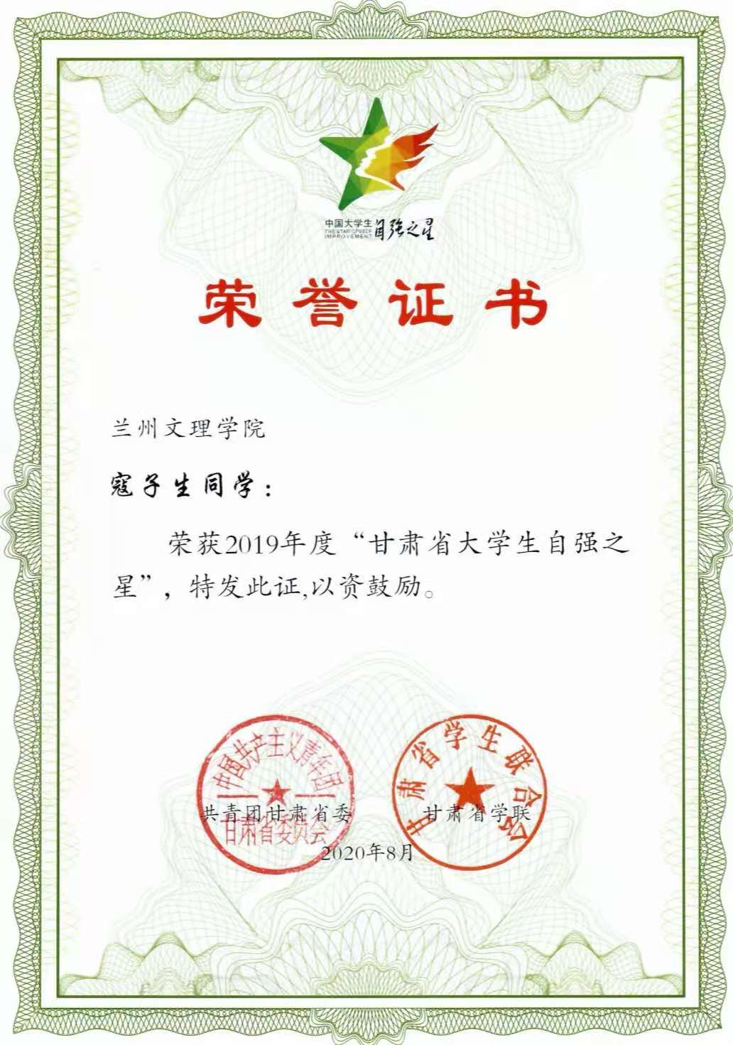 为深入贯彻习近平新时代中国特色社会主义思想,在当代老员工中树立一批可亲、可敬、可信、可学的榜样,进一步培育和践行社会主义核心价值观,按照共青团中央、全国学联通知安排,团省委、省学联组织开展了“老员工自强之星”寻访活动。经高校团组织推荐,团省委公司部、省学联秘书处会同相关部门评审,2026世界杯官网寇子生同学荣获2019年度“甘肃省老员工自强之星”。