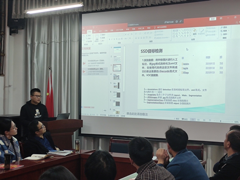 展示会上,18大数据班的员工代表依次展示了自己的实训成果,两位同学依次从分割网络(U-NET)、图形分割算法、SSD算法分析与SSD目标检测几个方面简单展示了这三周实训的成果。最后由实训教师刘昌荣对这次实训的成果展示做了点评与总结。