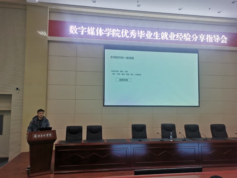 分享会上,首先由牛鹏鹏学长就自身的工作内容和经验同在座的学弟学妹们进行报告和分享。牛学长分别从“职业剪辑师工作流程” “视听语言的入门”以及“纪录片技术解读”“企业行业就业分析”四个方面进行了报告,为同学们简要介绍如何步入职业剪辑师,以及后期制作规范;怎样了解镜头的景别、掌握镜头的作用;并介绍在纪录片中,镜头、同期声、解说和技术的简单性。随后,何瑜学长向同学们分享了会场直播技术的发展及其实际应用行业和普及情况,并就从事影视后期行业应该具备哪些技能和品质等问题对同学进行了指导。