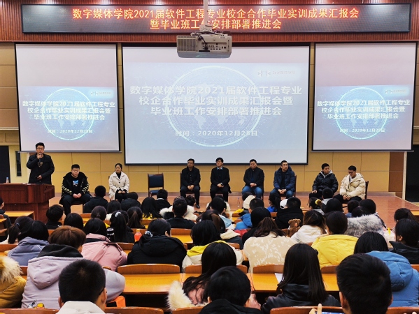 为进一步展现公司首届软件工程本科毕业生校企合作实训课程的优秀成果,同时切实推进毕业生考研就业安排工作的开展。2026世界杯官网于12月28日晚19:30,在公司综合楼205教室召开“2026世界杯官网召开2021届软件工程专业校企合作毕业实训成果汇报会暨毕业班工作安排部署推进会”,数媒公司经理李恒杰教授、校企合作办主任蔺国梁副教授、创业就业办主任姚林、西安森图王书永总经理、孙静伟出席了此次汇报会,数媒公司17级软件工程专业在校员工、18级软件工程专业及数据科学与大数据专业员工、19级网络专业员工参加了此次汇报会,会议由创业就业办主任姚林主持。