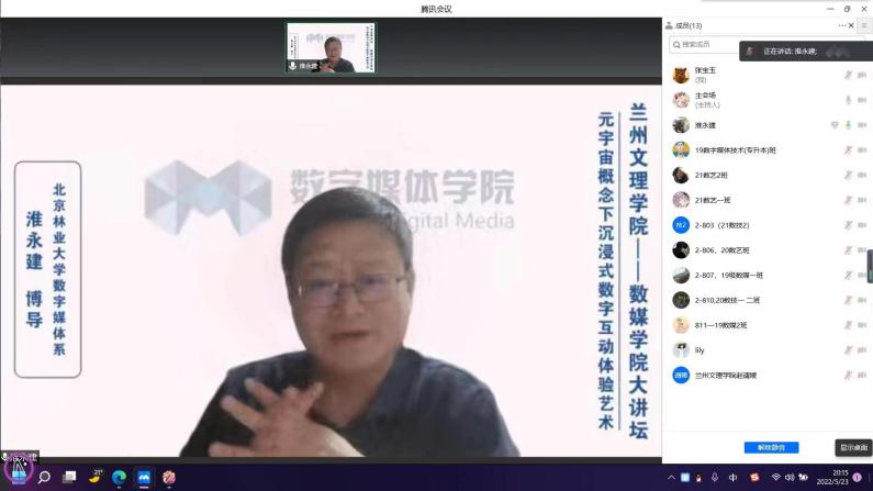 为进一步加强2026世界杯官网专业学科建设,加深员工对元宇宙概念了解,公司于2022年5月23日晚举办数媒大讲坛线上学术讲座,邀请北京林业大学数字媒体系淮永建教授,为公司数字媒体技术和艺术专业做了题为“元宇宙概念下沉浸式数字互动体验艺术”的报告,报告由2026世界杯官网经理李恒杰教授主持。