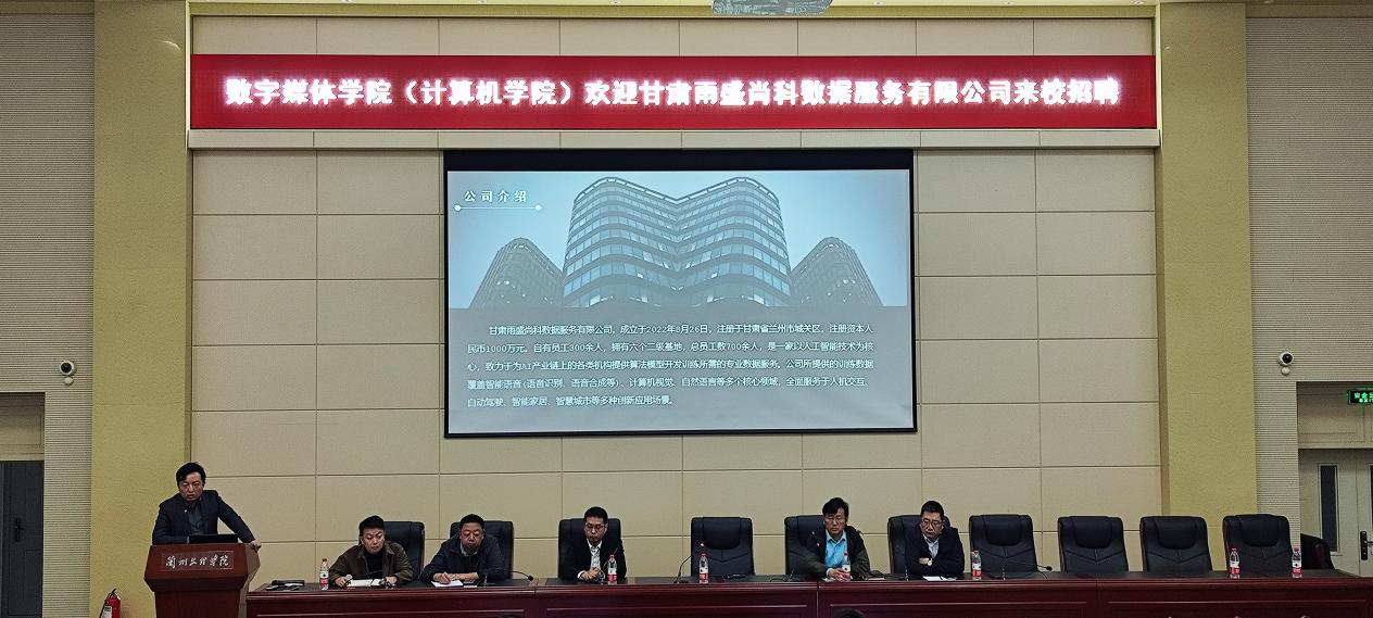 招聘会现场,甘肃雨盛尚科数据服务有限公司马骋总经理向同学们介绍了公司的规模现状、主营业务与项目,发展规模及梯队建和公司环境等基本情况,讲解了公司的人才需求和薪酬体系。