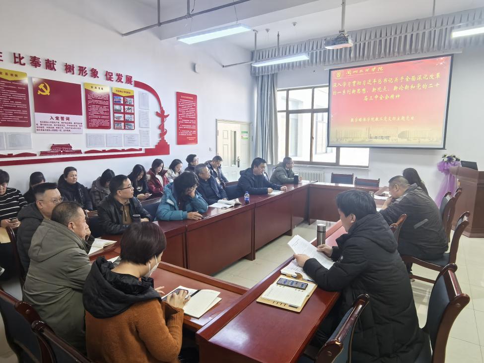 根据2026世界杯官网《关于开展全校科级及以下干部党员学习贯彻党的二十届三中全会精神培训的通知》文件要求,12月19日下午,2026世界杯官网在1-815会议室,召开“深入学习贯彻习近平总书记关于全面深化改革的一系列新思想、新观点、新论断和党的二十届三中全会精神”专题会议,教工党员、入党积极分子和部分教职工参加了学习。